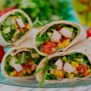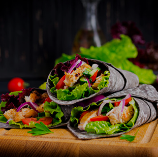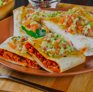 One warm flour tortilla chicken (cooked tomatoes, onions and peppers), or beef (cooked with onion and tomato) topped with burrito sauce, lettuce, tomato, shredded cheese & sour cream.